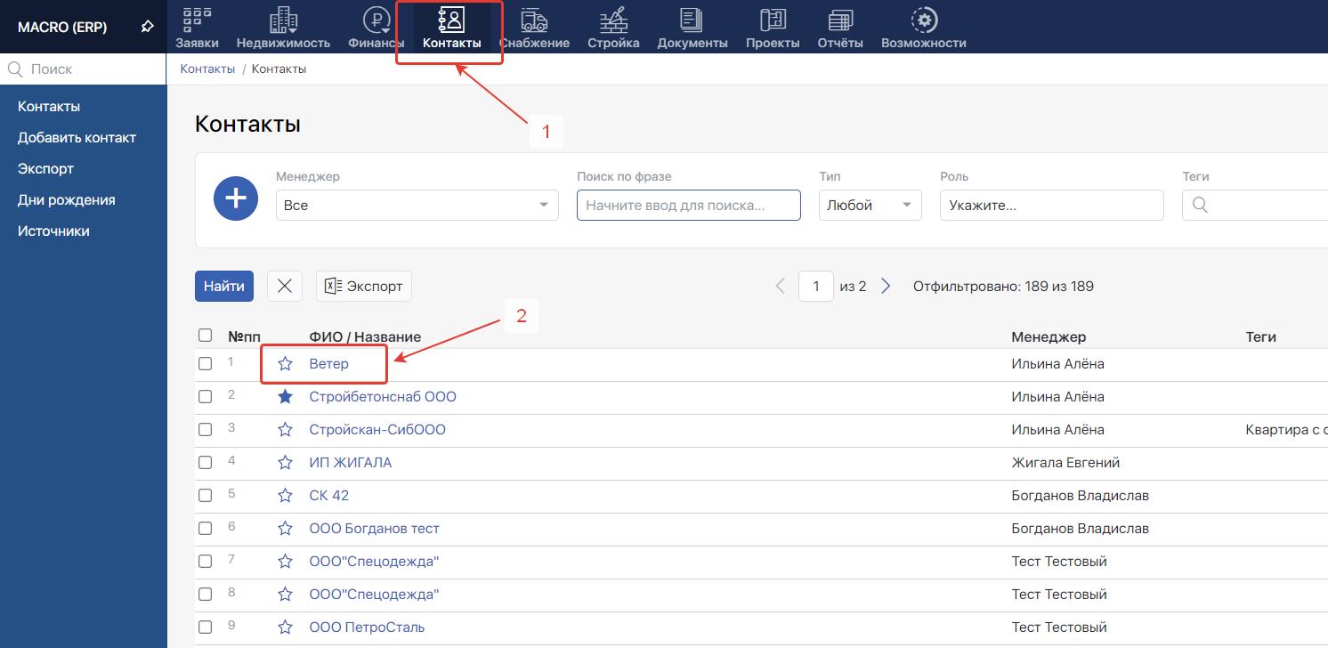 1. Перейдите в модуль Контакты и выберите контакт, нажав на него