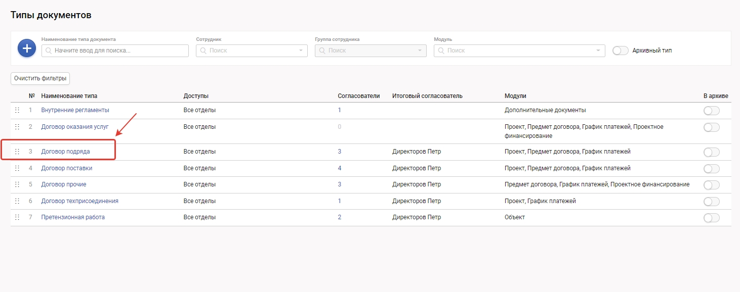 Важно: Если тип у основного договора сменить на тип, в котором не включена настройка "Доп. соглашение", то созданное дополнительное соглашение перестанет отображаться, но останется в системе со старым типом основного договора.