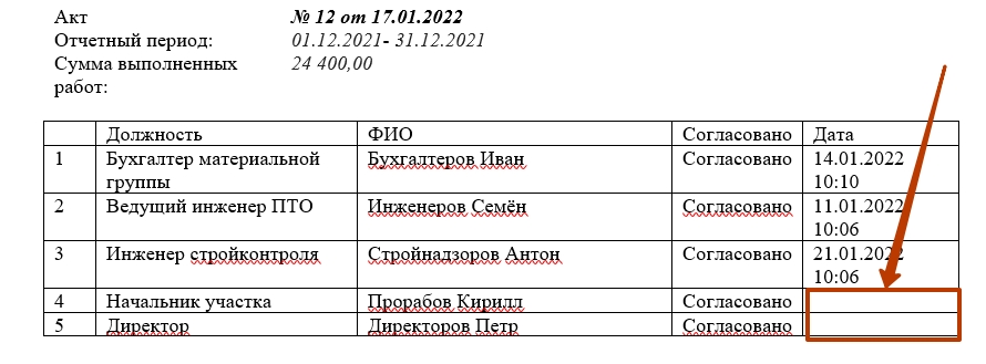4. Если сотрудник не согласовал акт - напротив его фамилии не будет указана дата и время согласования.
