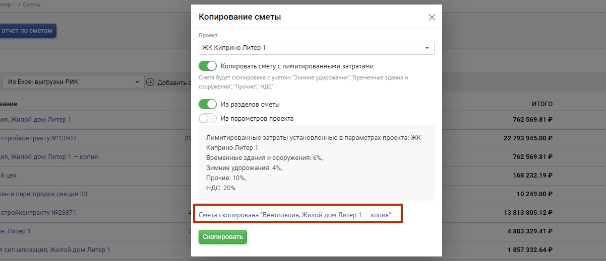 Вы можете произвести копирование сметы, загруженной или созданной в модуле "Стройка", в любой другой проект, или продублировать смету в текущем проекте. При копировании будет создан дубль сметы со всеми разделами, подразделами и ресурсами. Копирование значений лимитированных затрат производится опционально непосредственно при копировании. Скопировать часть разделов/подразделов сметы нельзя. При необходимости копирования части разделов смет - скопируйте смету целиком и отредактируйте.