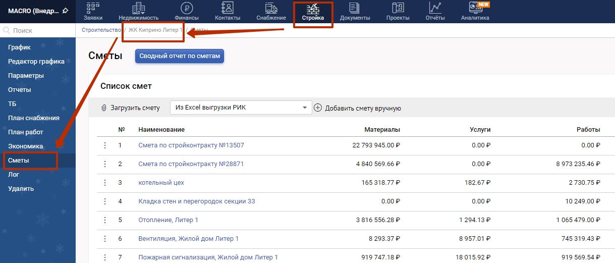 1. В модуле "Стройка" откройте проект и в проекте раздел "Сметы", в котором находится смета, которую необходимо скопировать