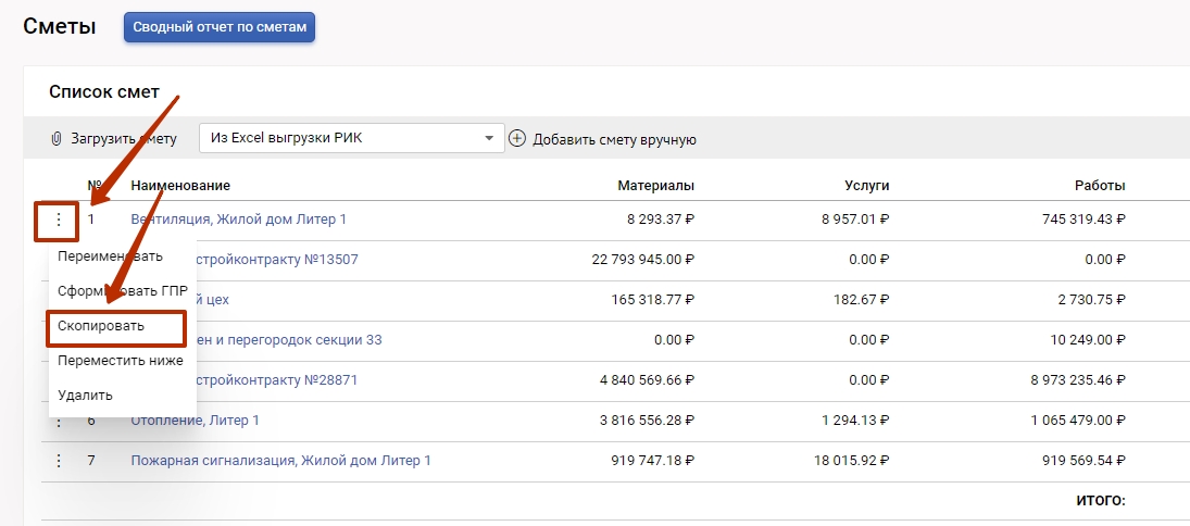 2. Слева от названия сметы, которую нужно скопировать, нажмите меню "три точки" - Скопировать