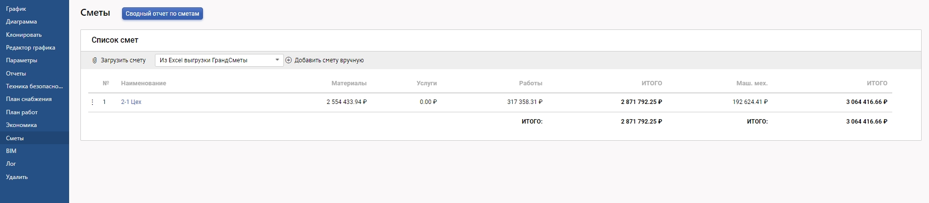 После этого в списке появиться загруженная смета, в системе отобразиться наименование сметы, а так же стоимость работ услуг и материалов в смете.