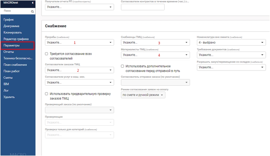 В модуле Снабжение используется 4 сценария возможной работы. Все сценарии выставляются в модуле Стройка к каждому проекту индивидуально в инструменте Параметры.