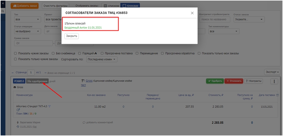 В заказе при нажатии на статус отображается информация, кто согласовал и когда
