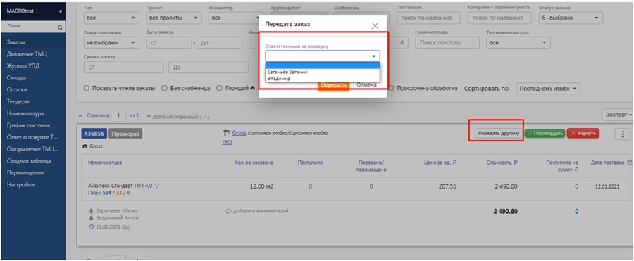 Если осуществлялась передача заказа на проверку другому сотруднику, заказ после подтверждения вернется проверяющему по умолчанию. После дополнительной проверки заказ поступает к согласователю заказов ТМЦ. 6- Указать сотрудников кто будет обрабатывать заявки и отправлять их в путь 7- Выбрать из списка сотрудников кто будет вести приемку и передачу материала. После указания всех параметров нажать кнопку «Сохранить».