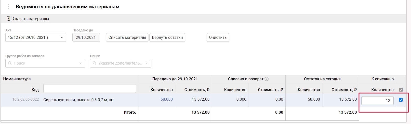 3. В ведомости по давальческим материалам появилось количество списанных ТМЦ и остаток на текущий момент.