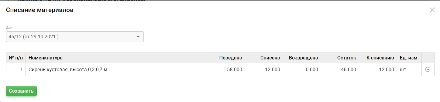 г) проверить номер и дату акта, перечень и объем материалов, нажать "Сохранить"