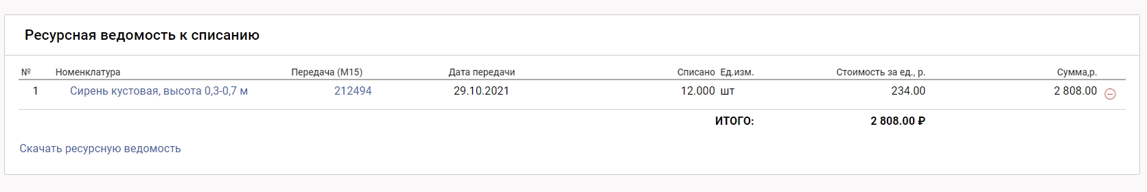 4. В акте выполненных работ отображается ресурсная ведомость с возможностью скачать в формате excel