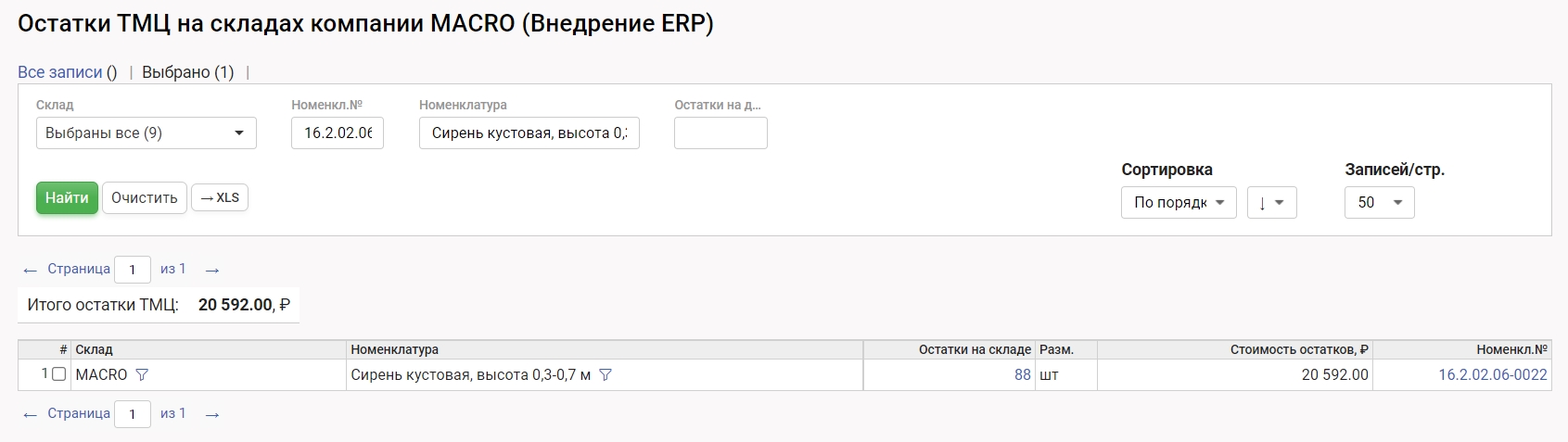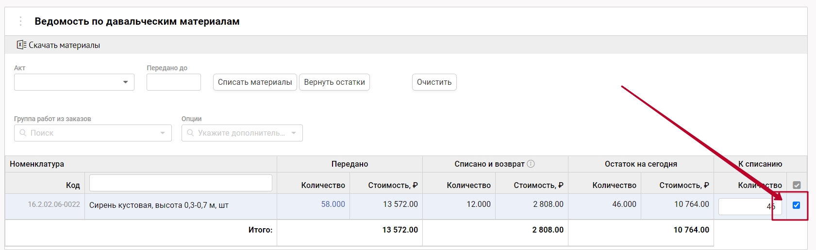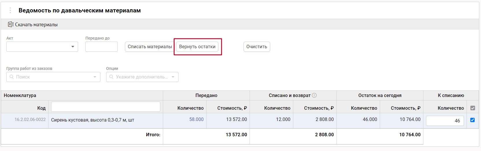 1. В договоре, на который были переданы материалы, откройте Ведомомость по давальческим материалам и выберите галочкой ТМЦ, которые необходимо вернуть на склад