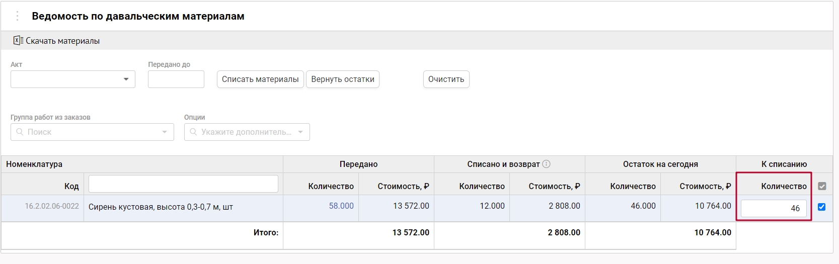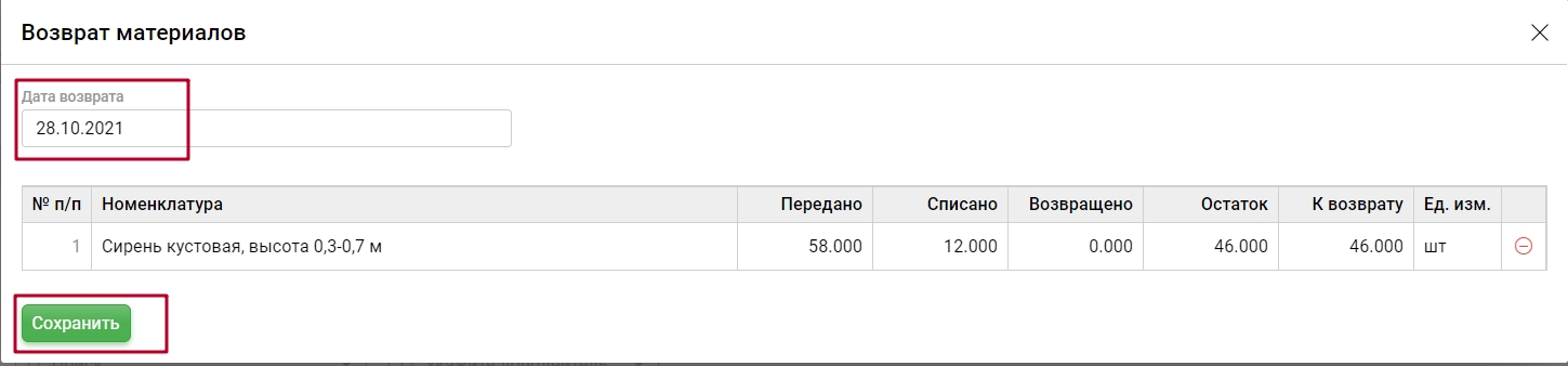 2. Укажите количество к возврату. По умолчанию выодится остаток на сегодняшний день (все материалы, переданные на договор, но не списанные на КС)