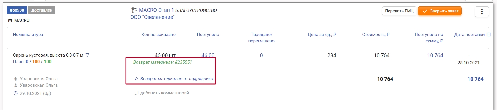 6. В Снабжении создался заказ в статусе "Доставлен", отражающий возврат материалов на склад