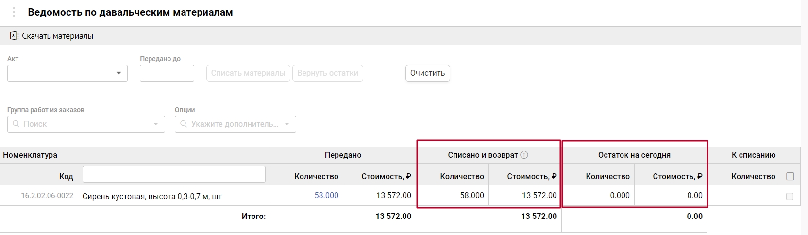 5. В Ведомости по давальческим материалам отразились возвращенные объемы
