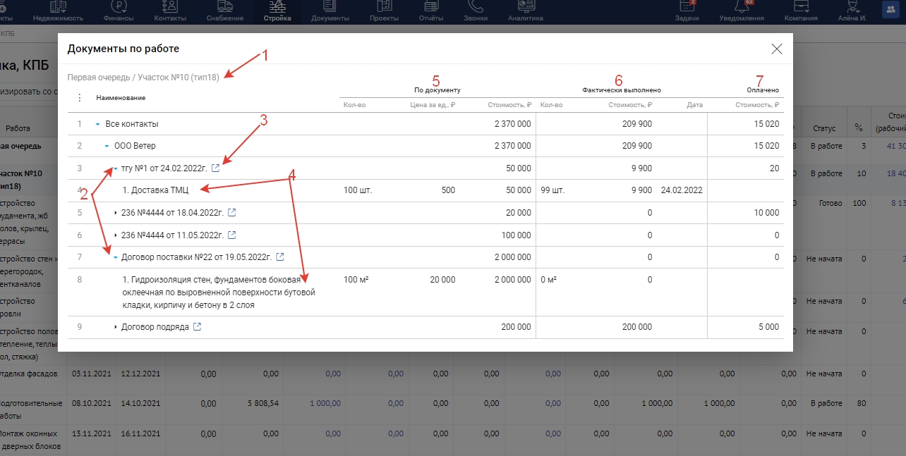 Работы - в данном столбце отображаются работы и группы работ из графика строительства.