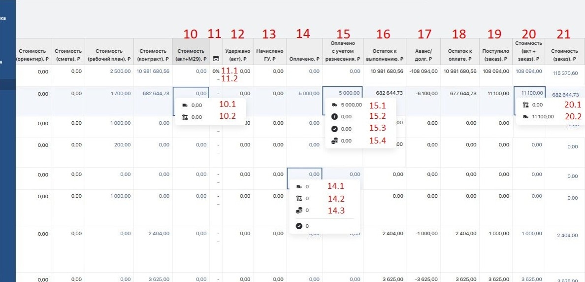 Аванс/долг - рассчитывается, как сумма двух первых показателей по колонке “Оплачено, ₽” - “Стоимость (акт), ₽” - “Поступило (заказ), ₽”. Долг отображается со знаком минус.