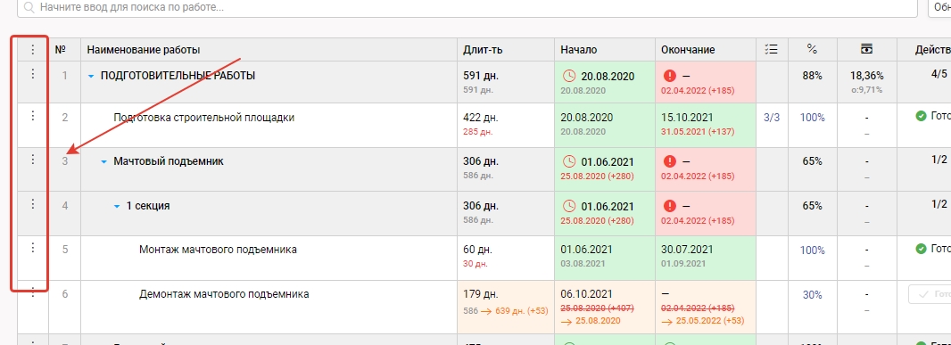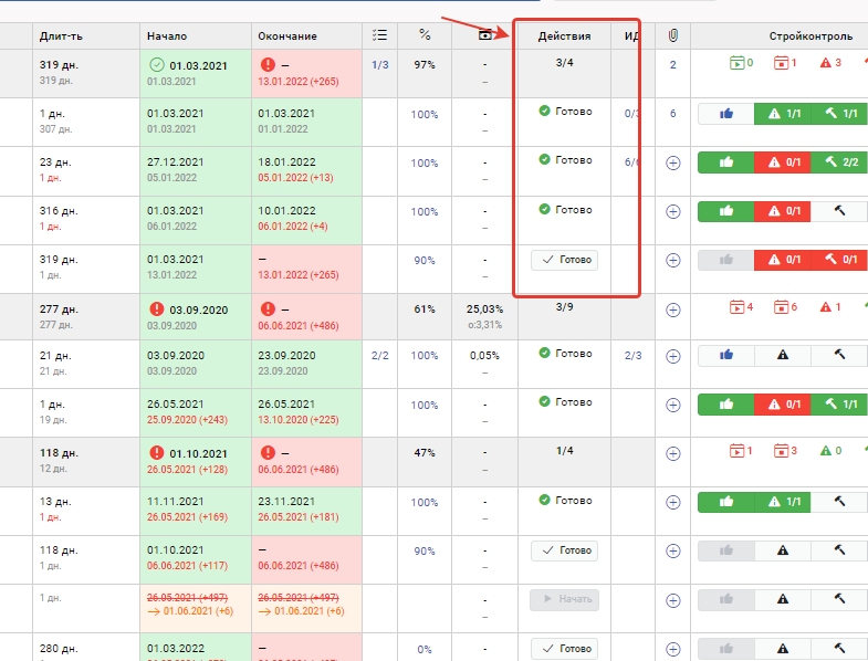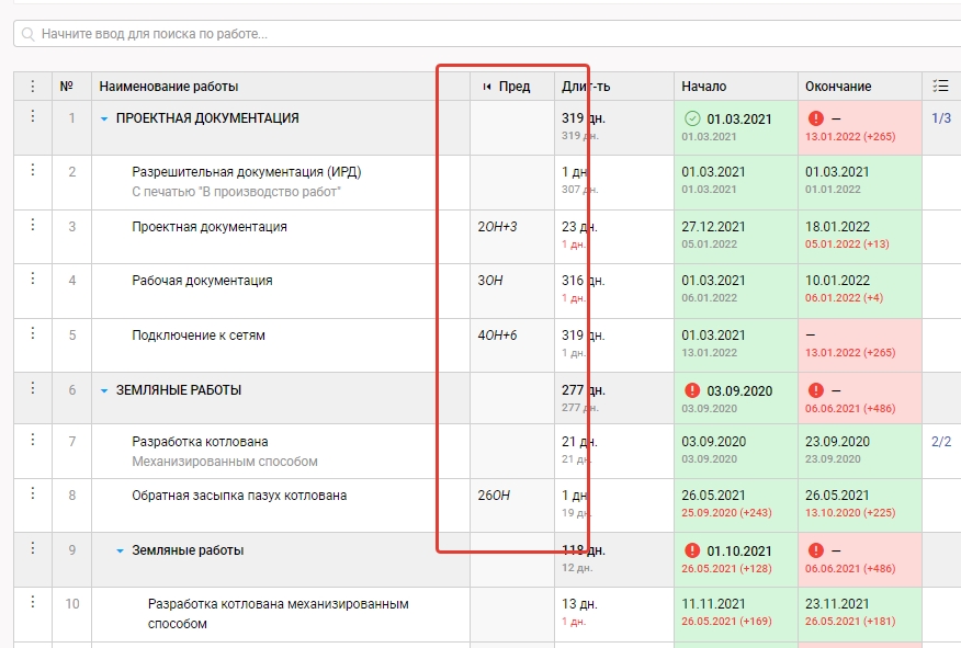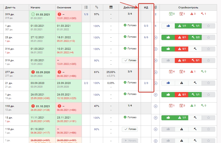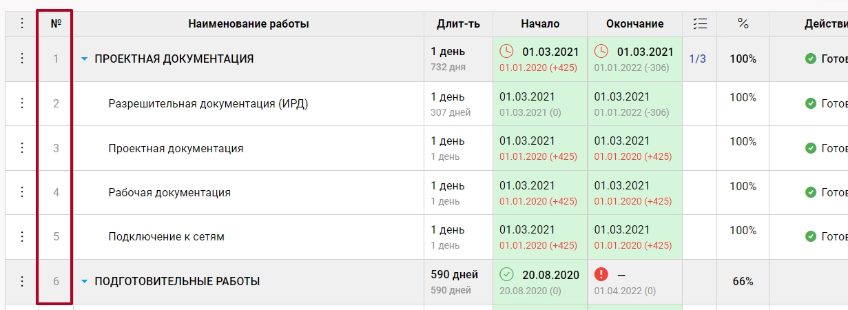 5. Длительность - продолжительность работ, рассчитанная как разница между датой окончания и датой начала работы.