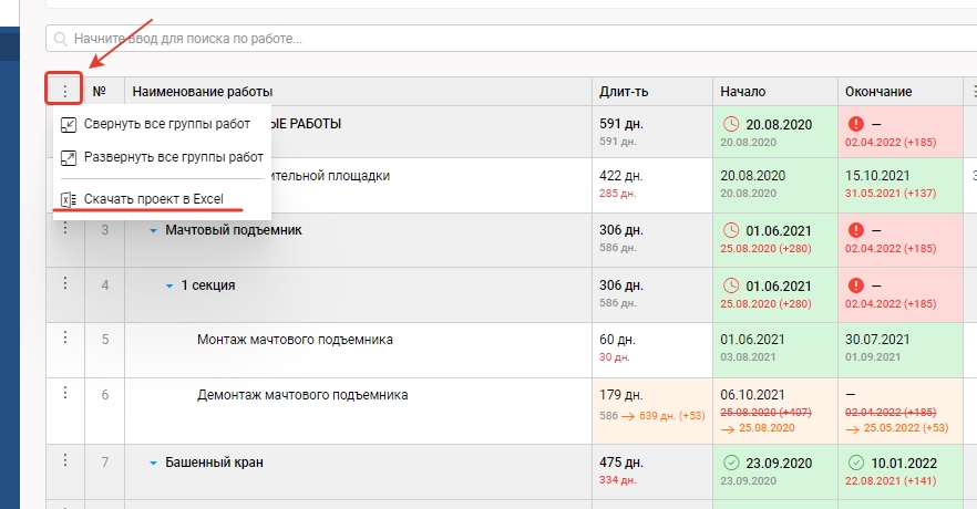 В левом верхнем углу шапки графика инструмент меню позволяет развернуть или свернуть все группы работ в ГПР, а также скачать ГПР в Excel в виде таблицы с перечнем работ, датами начала и окончания.