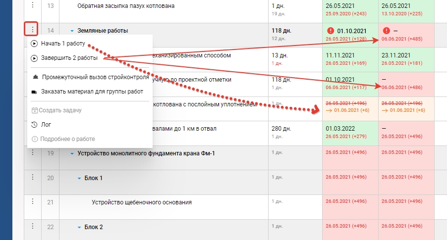Просроченные - работы, плановая дата начала и/или окончания которых прошла, но работы не начались и/или завершились в плановую дату.