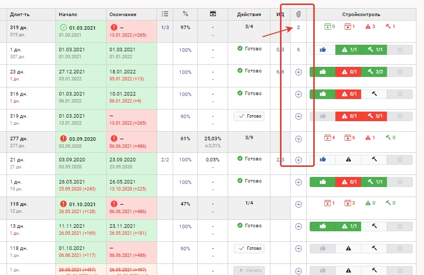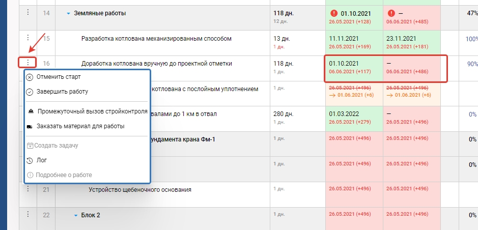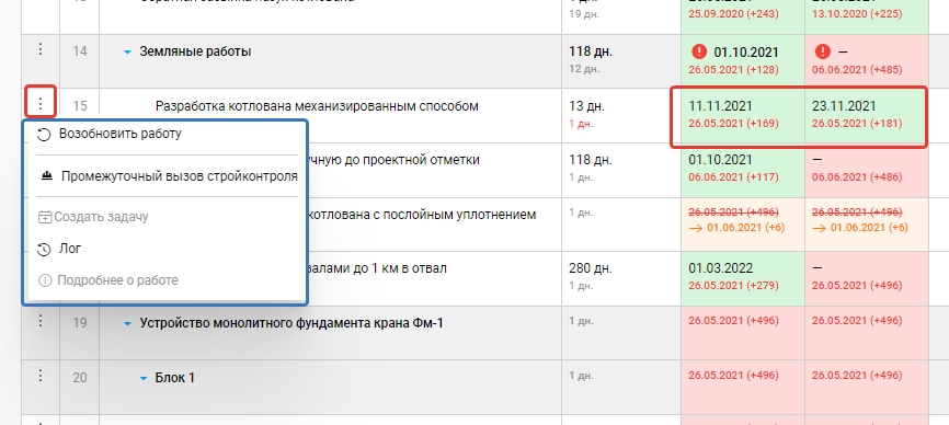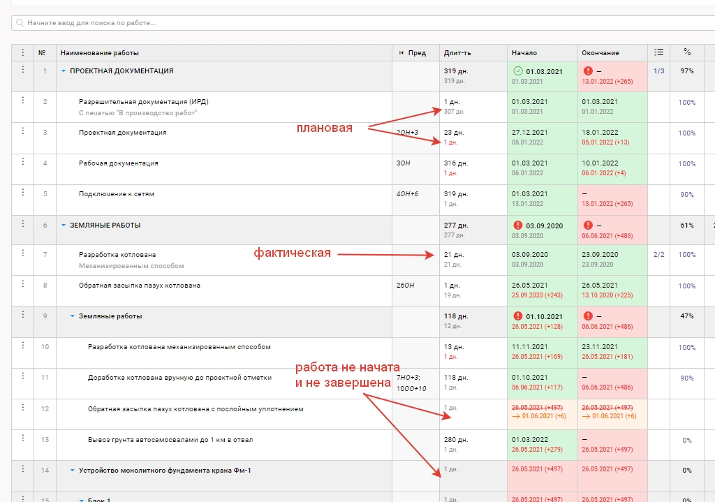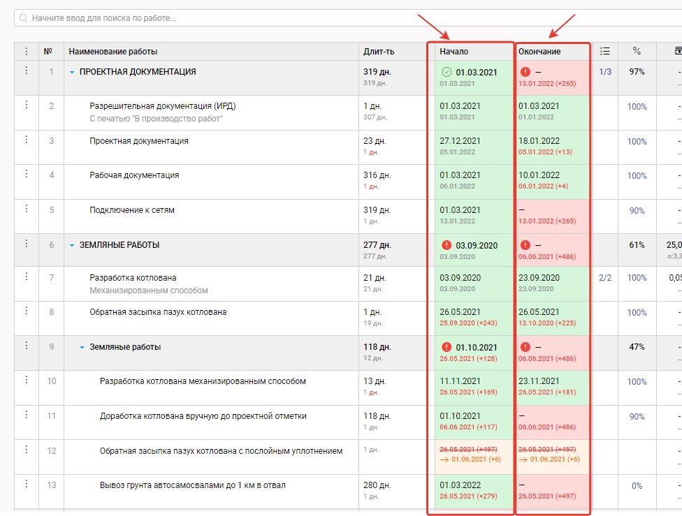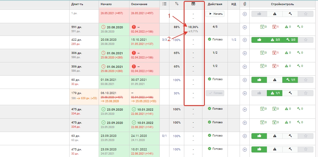 Разница между плановой и фактической датой отображается в скобках в нижней строке рядом с плановой датой.