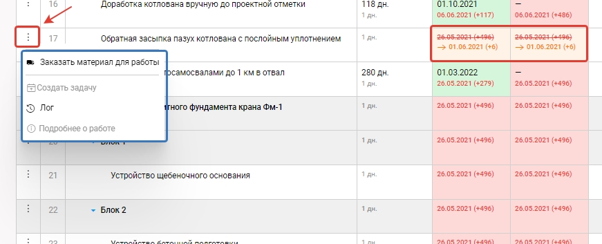 Три точки около группы работ позволяют: - начать сразу несколько работ в группе - завершить одновременно несколько работ в группе - вызвать стройконтроль - заказать материал для группы работ (создастся заказ на поставку ТМЦ) - просмотреть подробный лог по данной группе работ