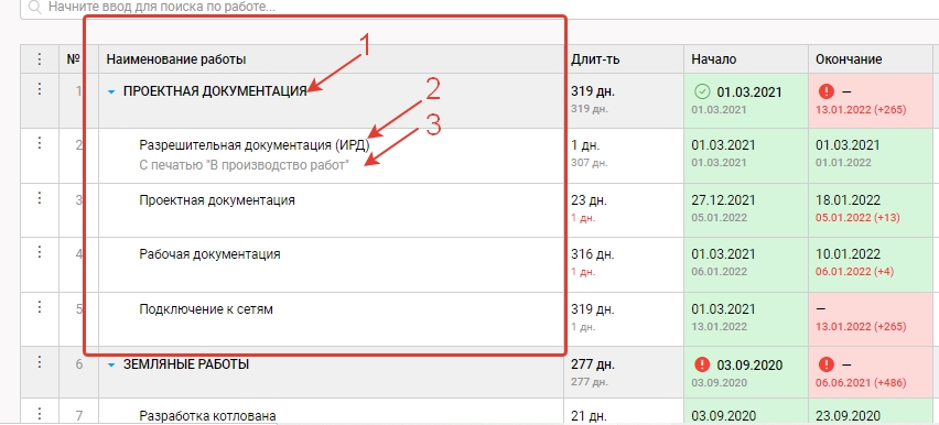 3. Наименование - название групп, подгрупп и работ. Название групп (1) выделено жирным шрифтом, работ (2) - обычным. Строки групп и подгрупп подсвечены серым цветом (1). Комментарии, указанные в редакторе ГПР, отображаются под названием работы серым шрифтом.