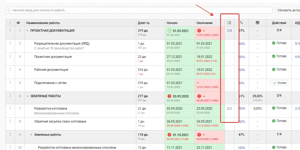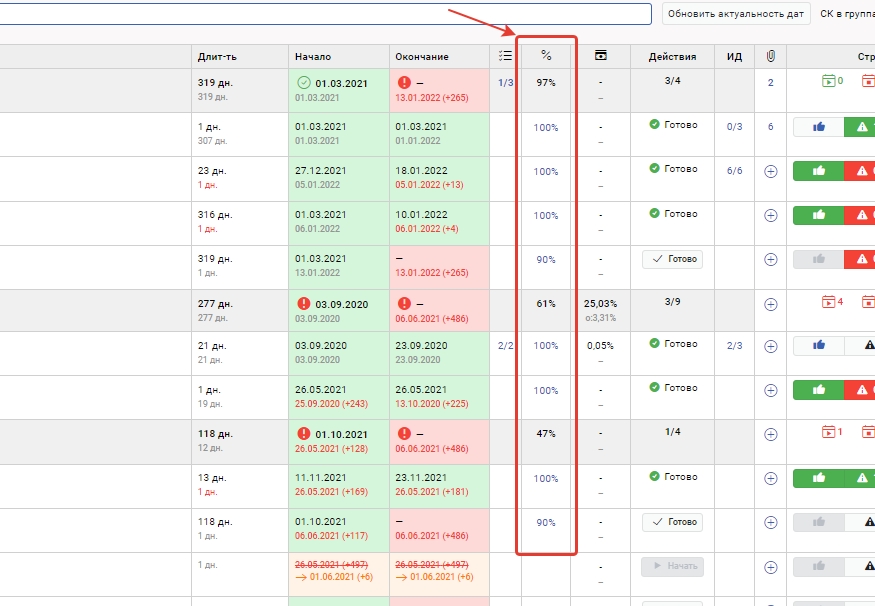 8. Процент готовности работ - показывает степень готовности каждой работы (выставляется вручную) и группы работ (считается автоматически исходя их степени готовности вложенных работ).
