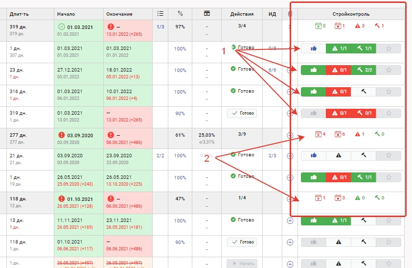 - Отображения приемки работ, предписаний, дефектовок, качество работ по работам (1) - Отображение сводной информации по группе работ (2)