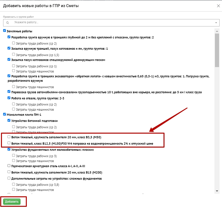 На рисунке для примера указано, материалы, которые вынесены из расценки отдельной позицией в данном окне отображены жирным, но при этом работой не являются и в ГПР перенесены быть не должны
