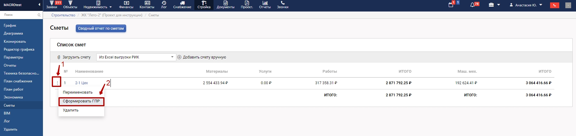 Далее в списке смет напротив каждой загруженной сметы нажмите три точки (справа от наименования сметы) (1), далее в раскрывшемся меню выберете "Сформировать ГПР" (2)