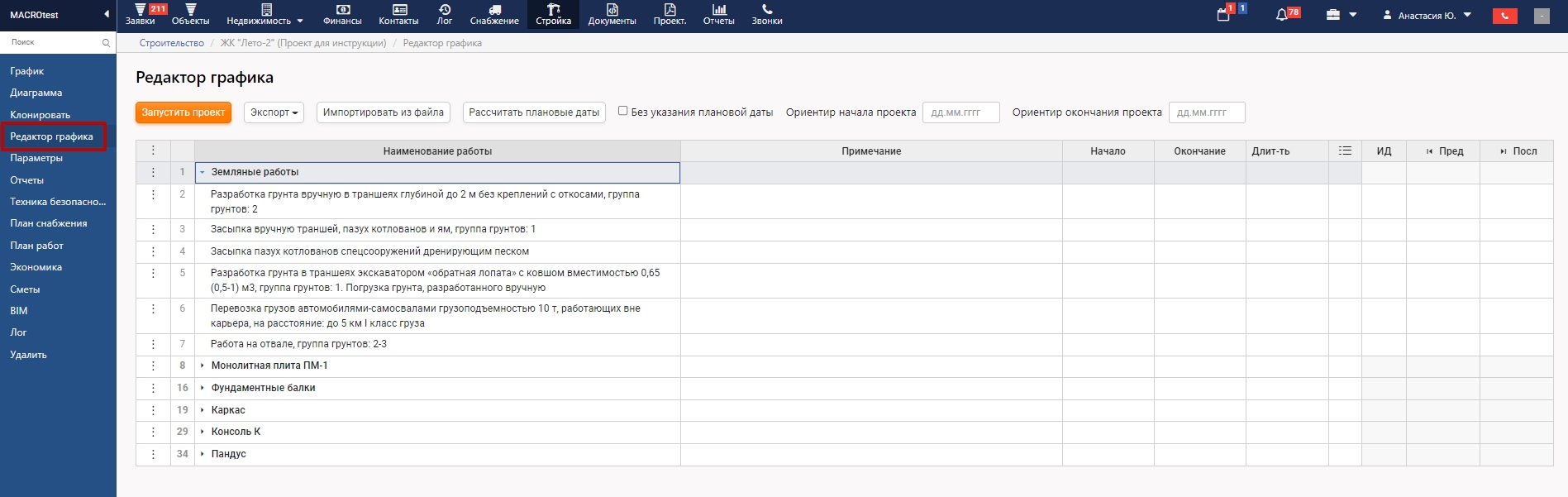 Далее перейдите в "Редактор графика" (меню слева), в открывшемся окне увидите заполненных ГПР работами из сметы с соответствующей вложенностью работ.