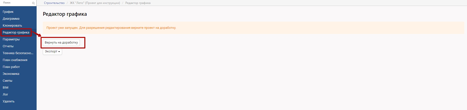 В случае, когда необходимо внести изменения в ГПР, после того, как он был запущен, ответственный за редактирование ГПР имеет возможность вернуть график на доработку. Для этого в в меню слева необходимо выбрать "Редактор графика", а далее нажать "Вернуть на доработку"