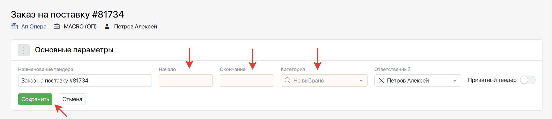 5. Нажмите кнопку «Заполнить», укажите даты проведения тендера и его категорию. После чего сохраните изменения.