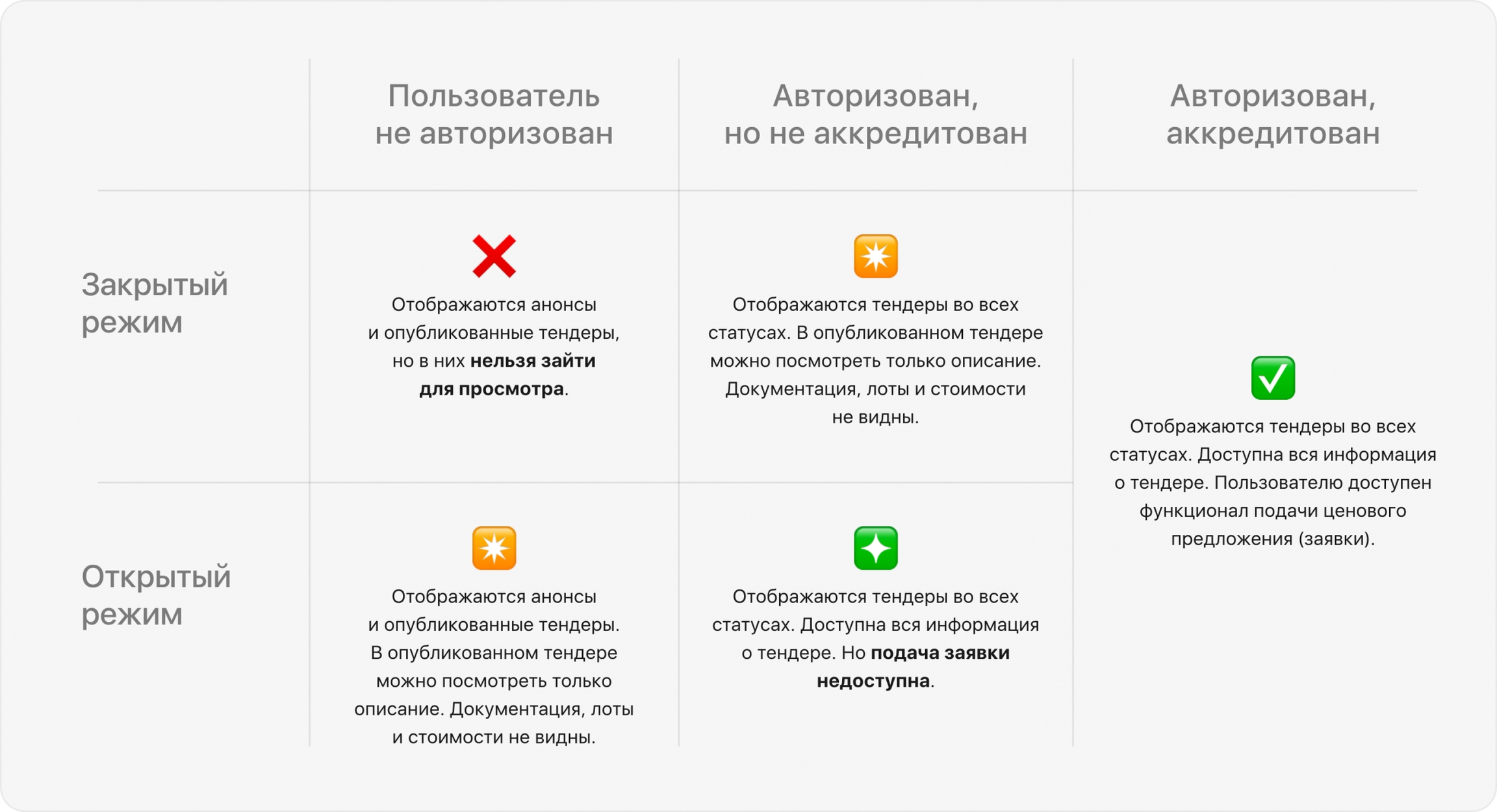 Неавторизованные пользователи смогут увидеть список тендеров в статусах «Анонс» и «Приём заявок», при переходе внутрь опубликованного тендера будет доступно только общее описание тендера. Авторизованным пользователям будет доступен список тендеров во всех статусах, при переходе внутрь опубликованного тендера будет доступно полное описание тендера с лотами и документацией. После получения аккредитации пользователь сможет подать заявку на участие в тендере.